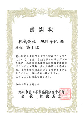 令和7年度は、回収期間10月21日~11月4日まで、11月4日の計測で86.3kgのリングプルが集まりました。12月3日の一水会で第1位~第3位の会社に青年部会長から感謝状が贈呈されました。次の車椅子の交換まで今後も継続して行います。